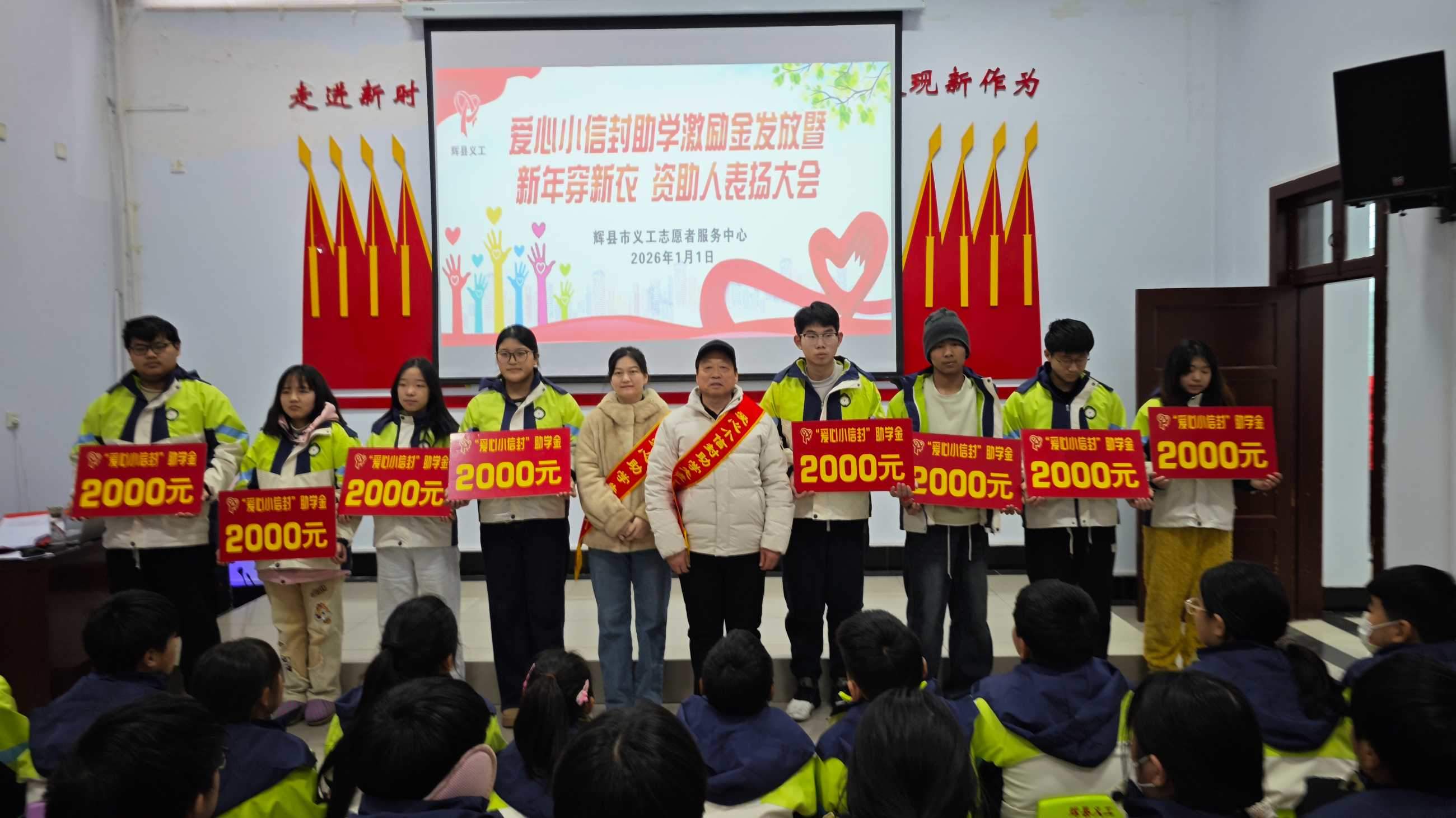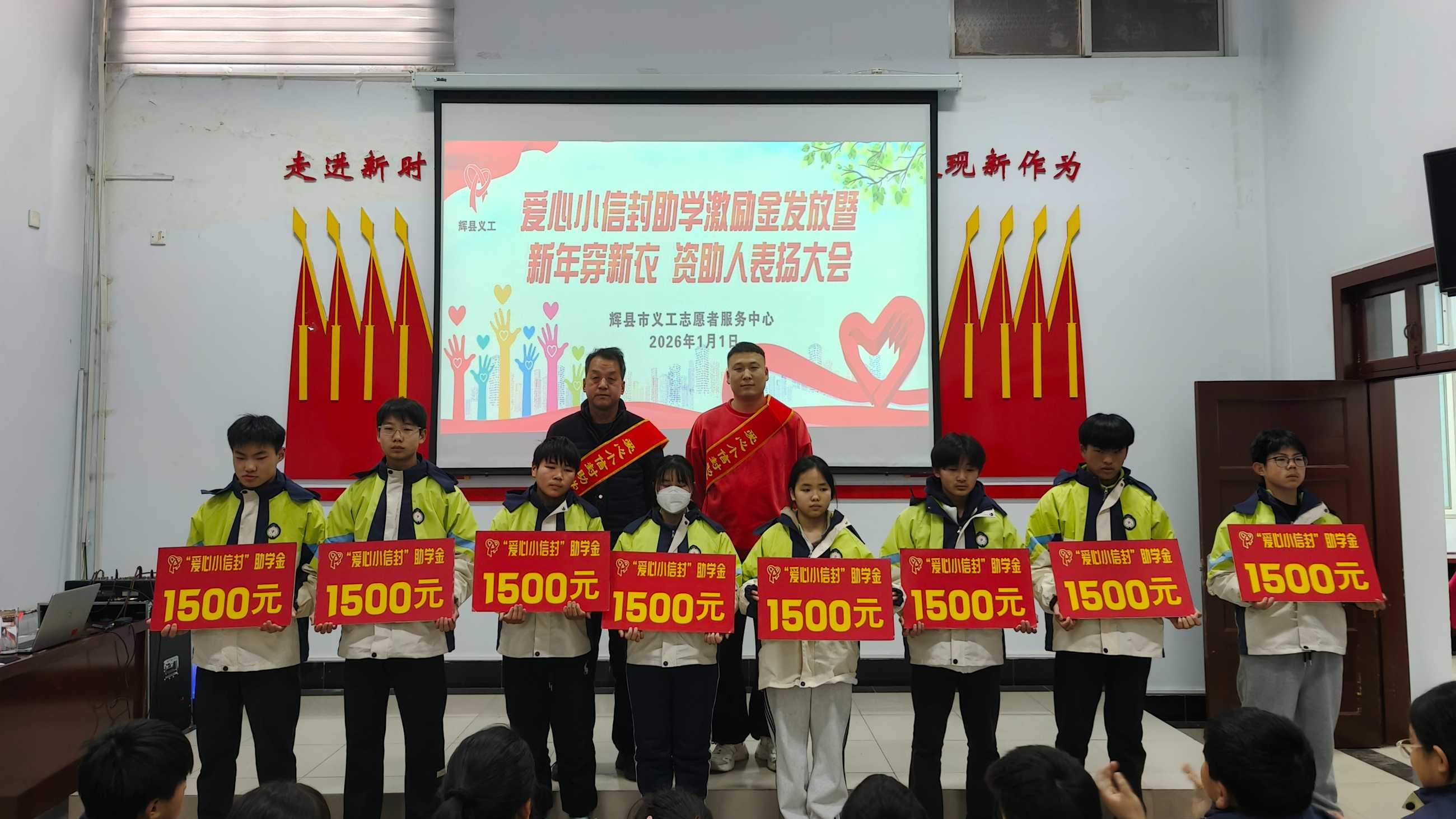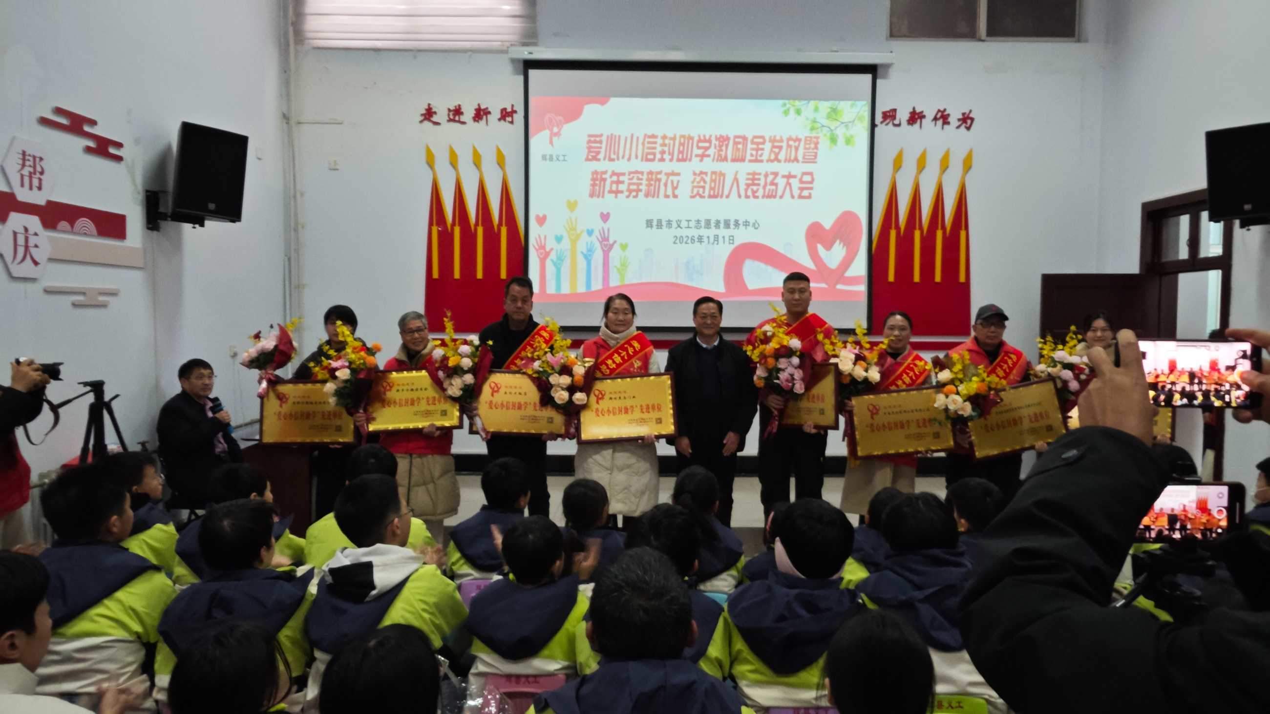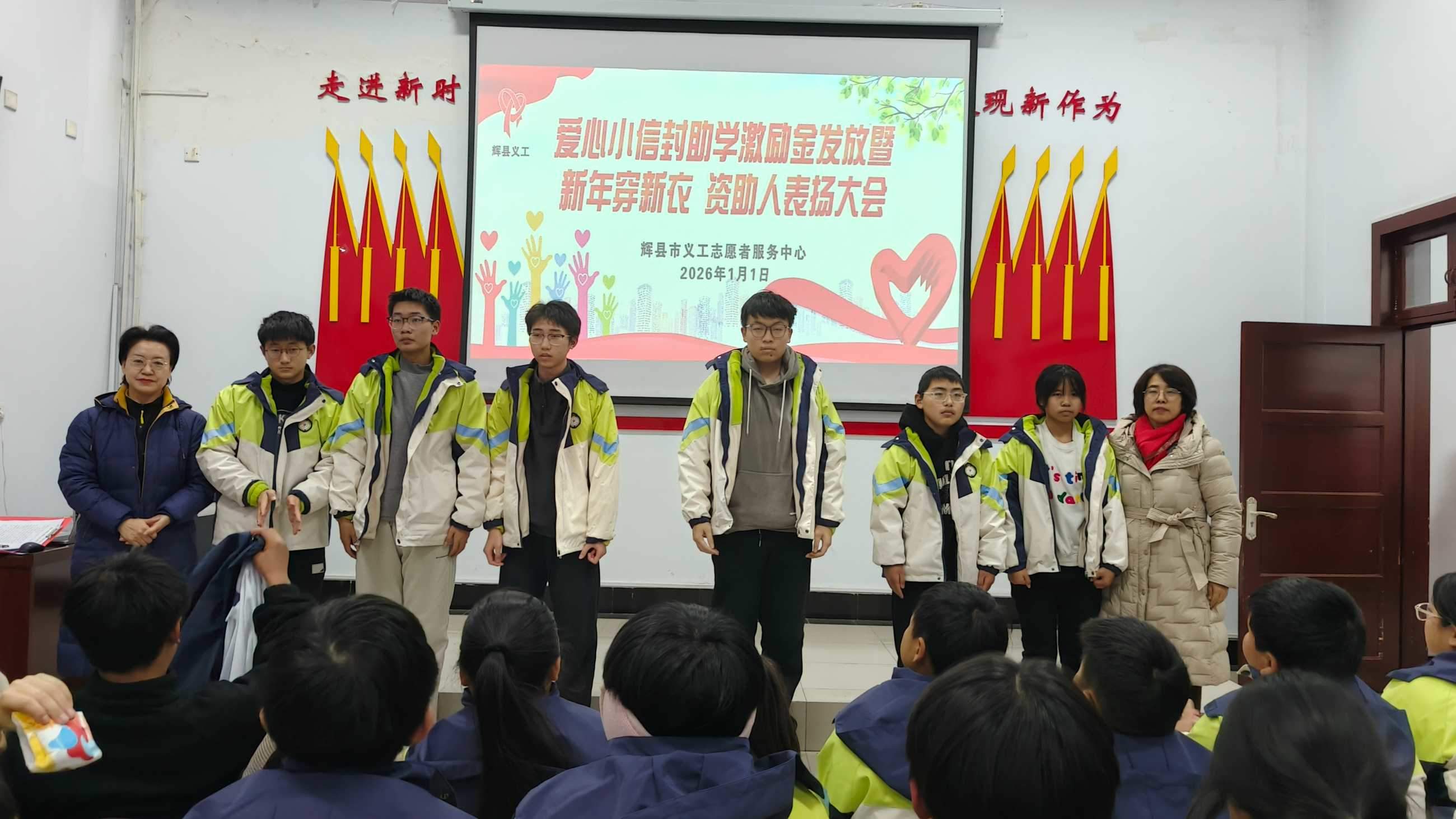 寒冬送暖,情满共城;善举传递,爱暖童心。202611日,新年的第一缕阳光洒向辉县大地,辉县义工爱心小信封助学激励金发放、新年穿新衣暨爱心资助人表彰大会在新时代文明实践中心温情启幕。102名学子在这一天穿上崭新的冲锋衣,领取总额18万元的助学激励金,在爱与关怀中开启新的一年。
