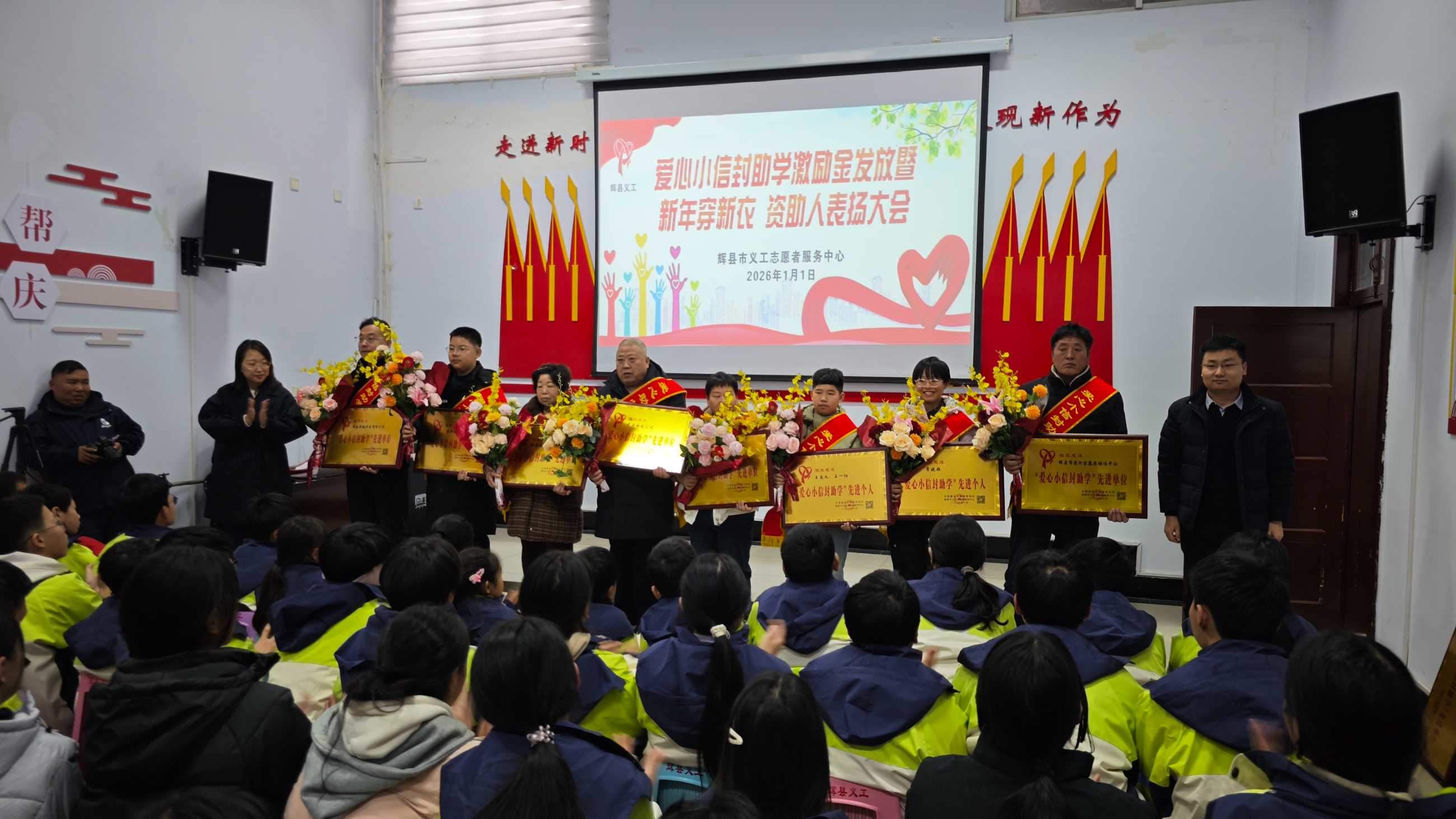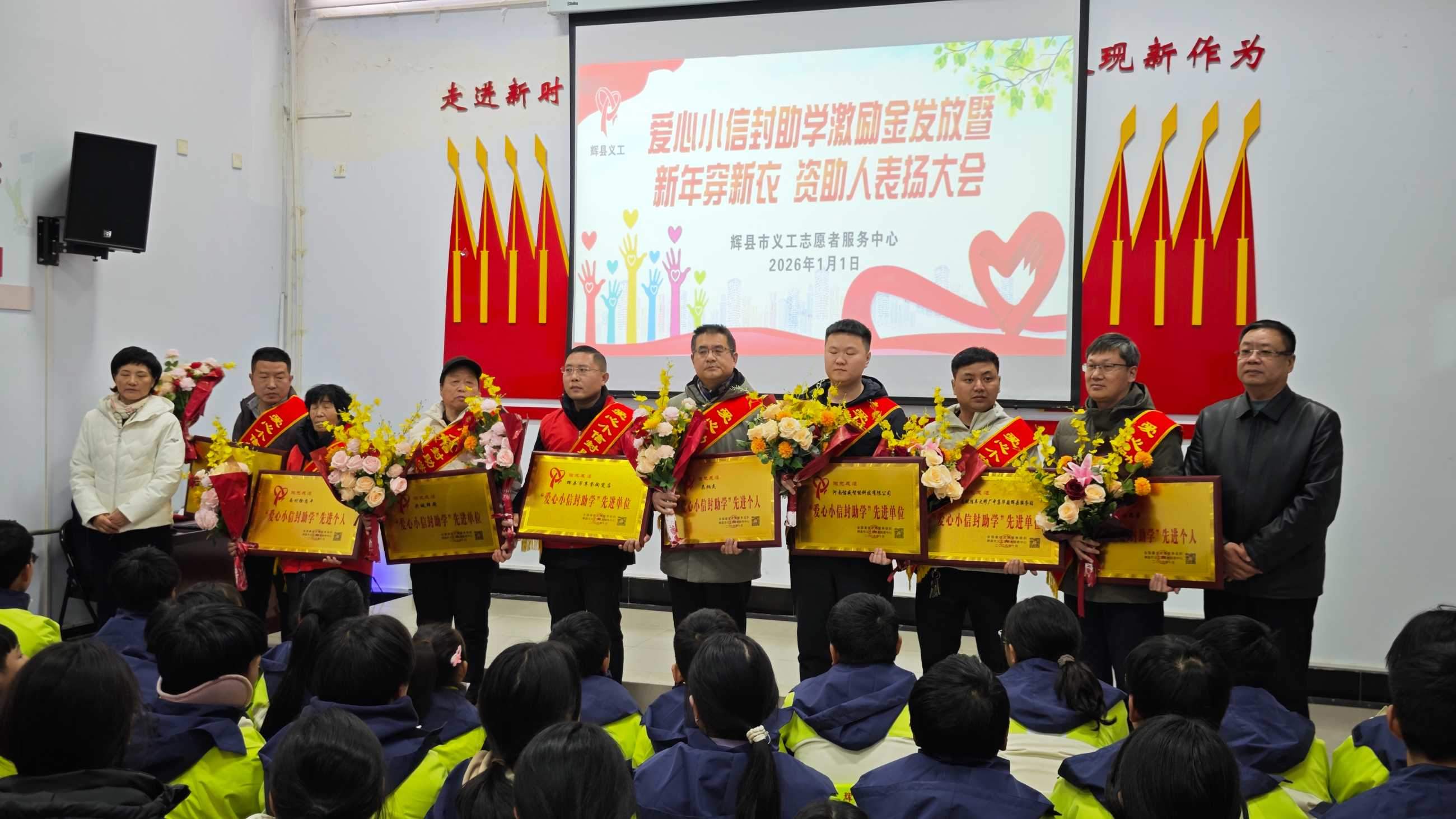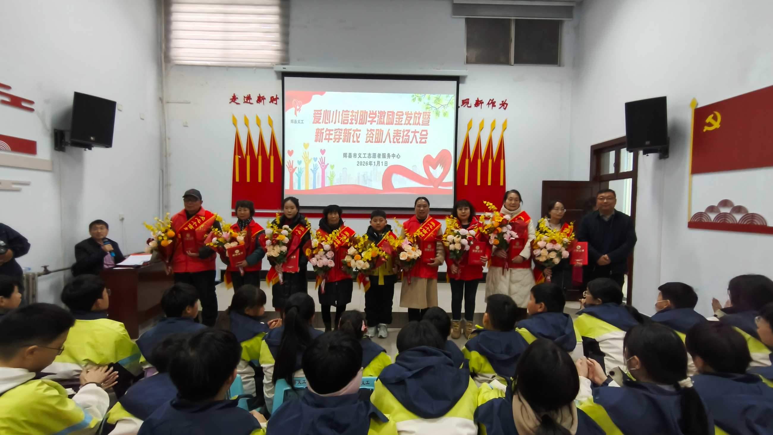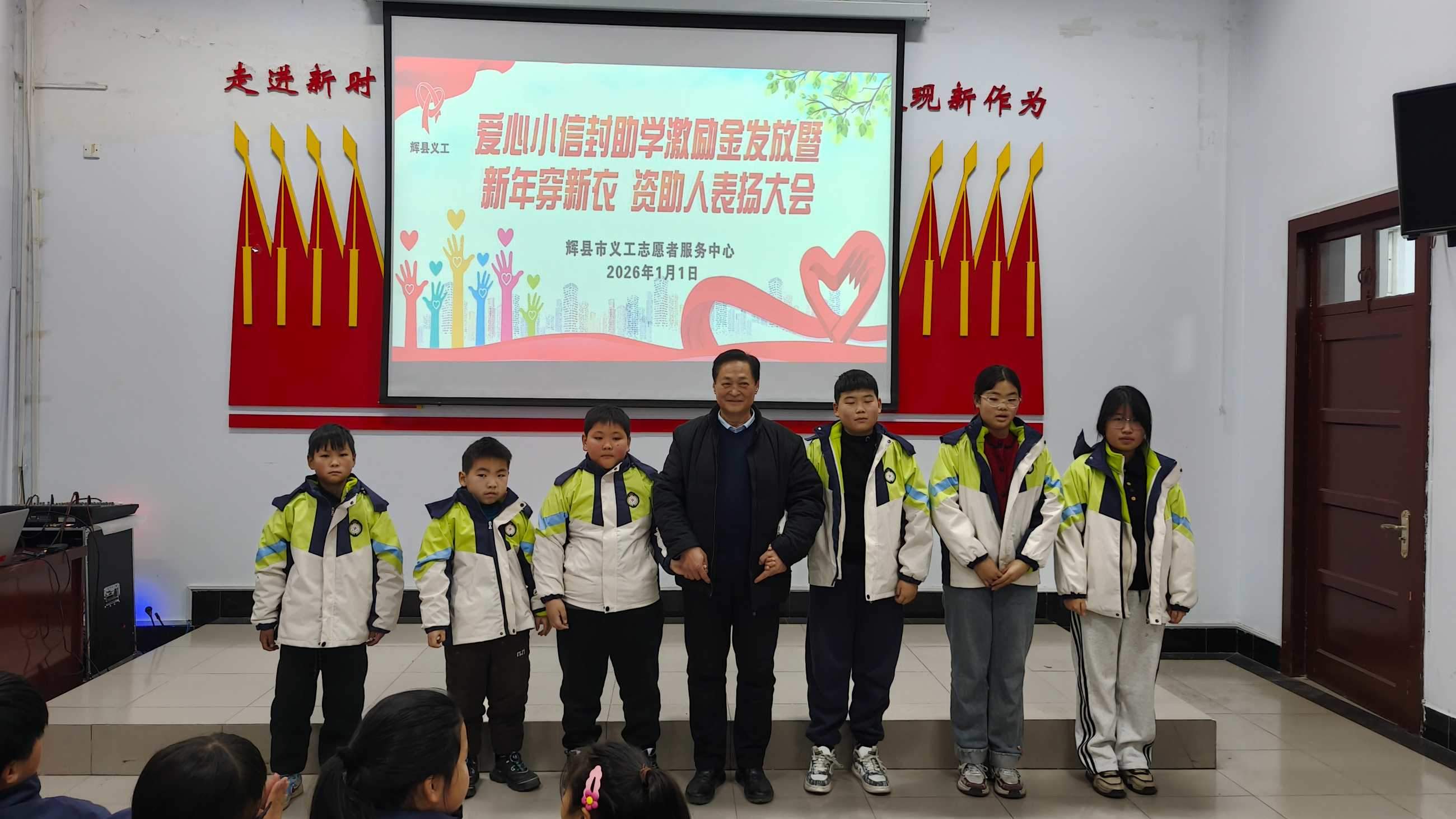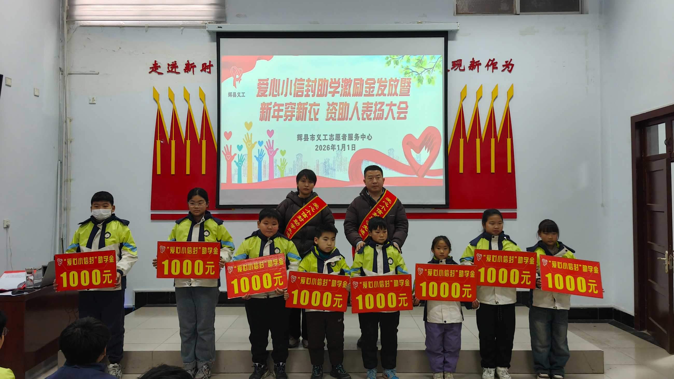 寒冬送暖,情满共城;善举传递,爱暖童心。202611日,新年的第一缕阳光洒向辉县大地,辉县义工爱心小信封助学激励金发放、新年穿新衣暨爱心资助人表彰大会在新时代文明实践中心温情启幕。102名学子在这一天穿上崭新的冲锋衣,领取总额18万元的助学激励金,在爱与关怀中开启新的一年。