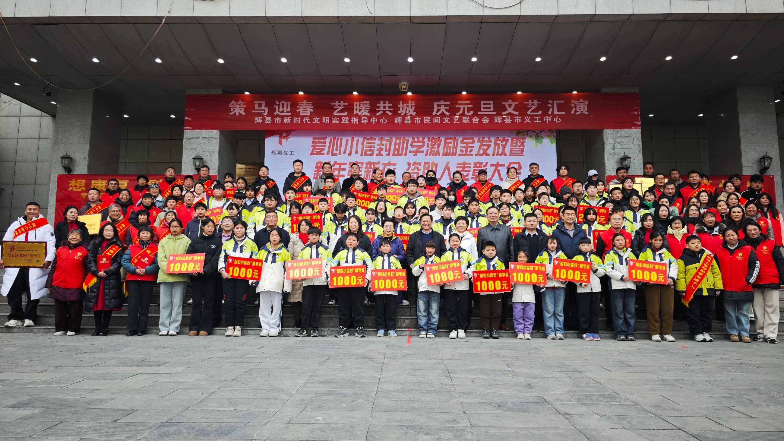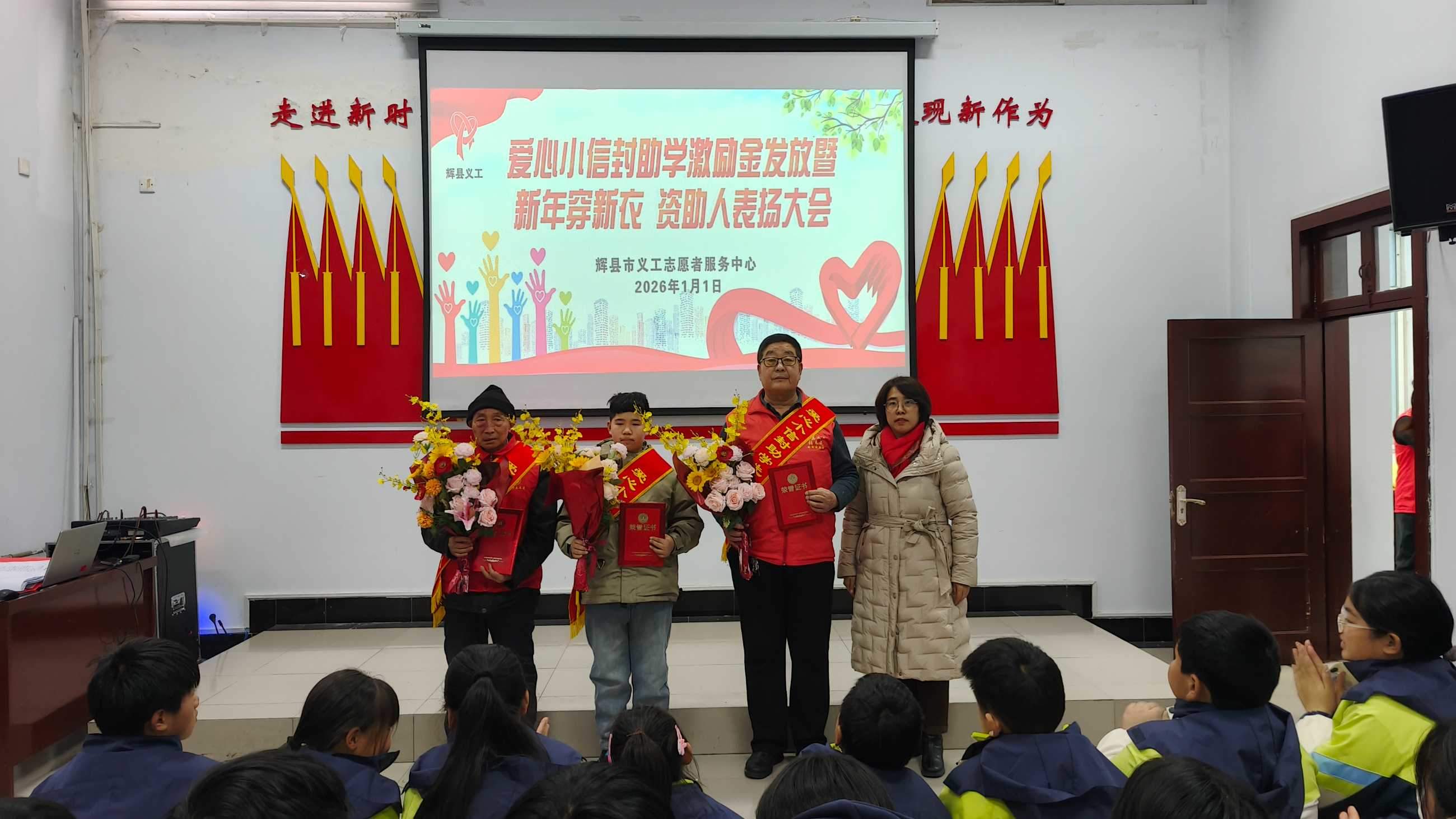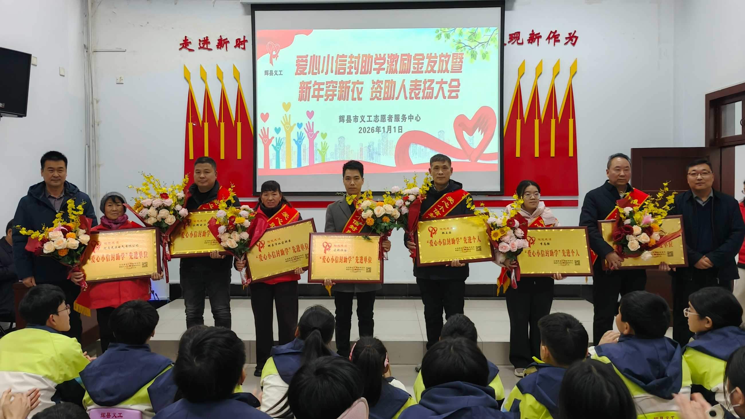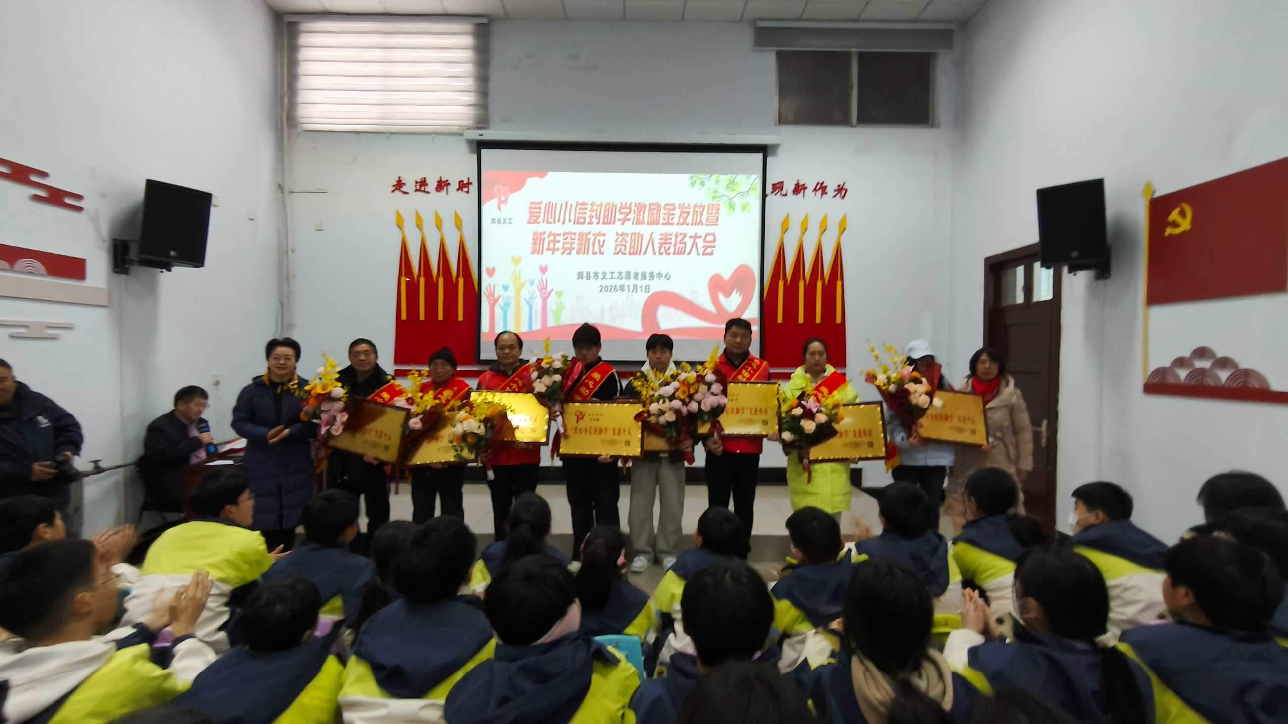寒冬送暖,情满共城;善举传递,爱暖童心。202611日,新年的第一缕阳光洒向辉县大地,辉县义工爱心小信封助学激励金发放、新年穿新衣暨爱心资助人表彰大会在新时代文明实践中心温情启幕。102名学子在这一天穿上崭新的冲锋衣,领取总额18万元的助学激励金,在爱与关怀中开启新的一年。