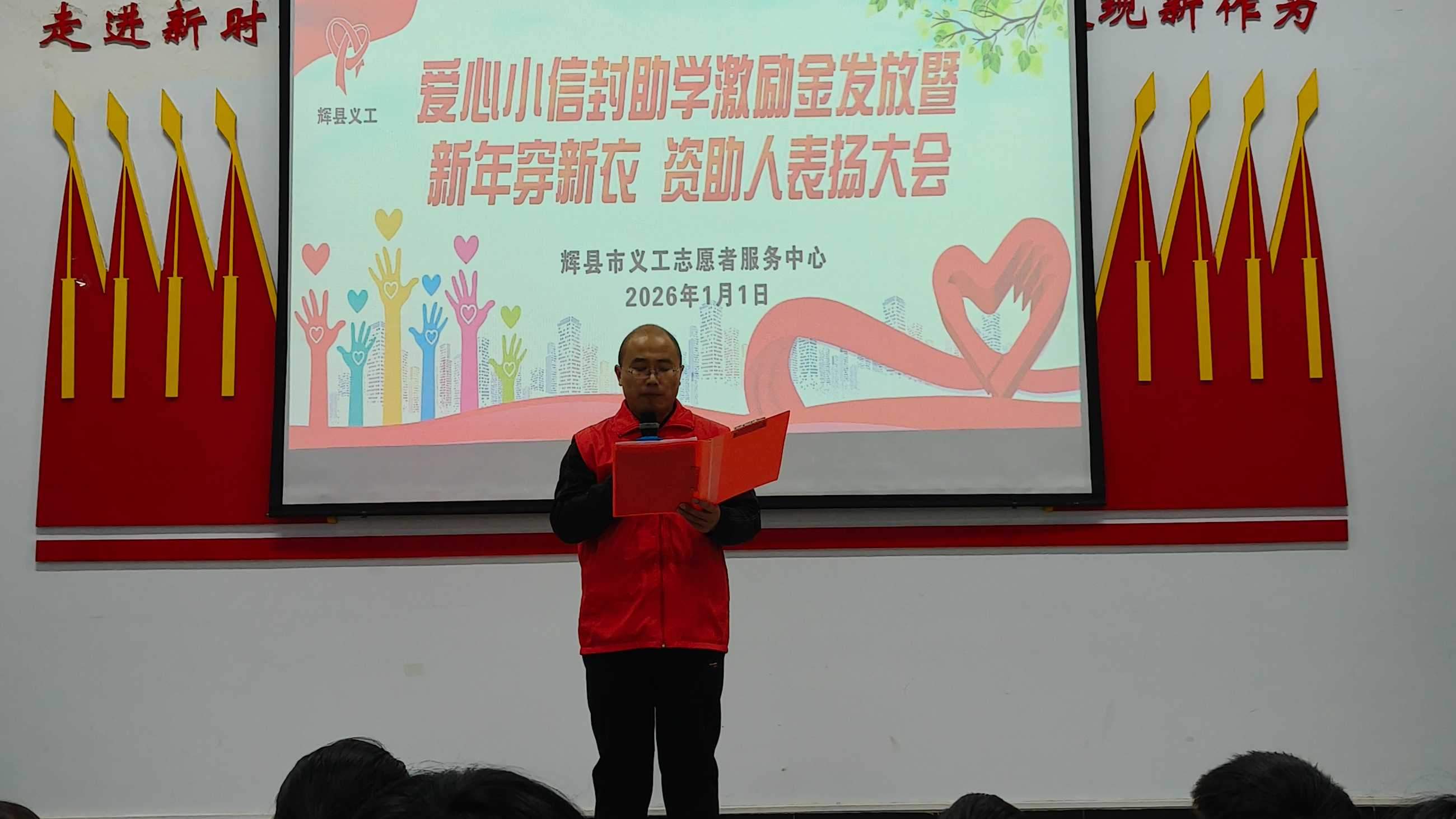 中国好人、辉县义工中心秘书长主持会议。寒冬送暖,情满人间;善举传递,爱暖童心。在这辞旧迎新、孕育希望的美好时节,我们怀着无比喜悦与感恩的心情齐聚一堂,隆重举行爱心小信封助学金、新年穿新衣发放暨爱心资助人表彰大会。首先,请允许我代表辉县义工中心,向在百忙之中莅临本次大会的各位领导表示最热烈的欢迎和最衷心的感谢!向长期以来心系教育事业、慷慨解囊相助的各位爱心人士,致以最崇高的敬意!向即将收获关怀与温暖、怀揣梦想的同学们,送上最真挚的祝福!
