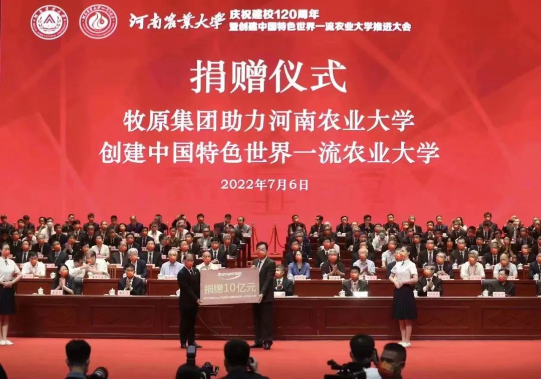 2022年7月6日,河南农业大学120周年校庆之际,河南农大1985级校友、牧原股份董事长秦英林向母校捐赠10亿元人民币,共建农大牧原畜牧产业联合研究院,用于提升养猪业全产业链发展水平,推进猪肉产业链上下游信息化、人工智能和产业互联网发展,助推河南农业大学创建世界一流农业大学,夯实河南农业基础,支撑产业发展,促进河南经济发展。